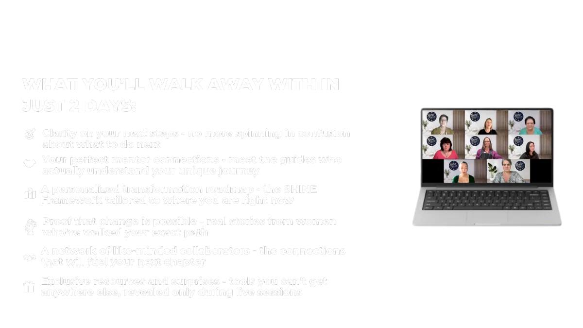 Meet the extraordinary women who'll guide your transformation over these two days. Each Mentor brings unique gifts, perspectives, and wisdom to support your SHINE journey.